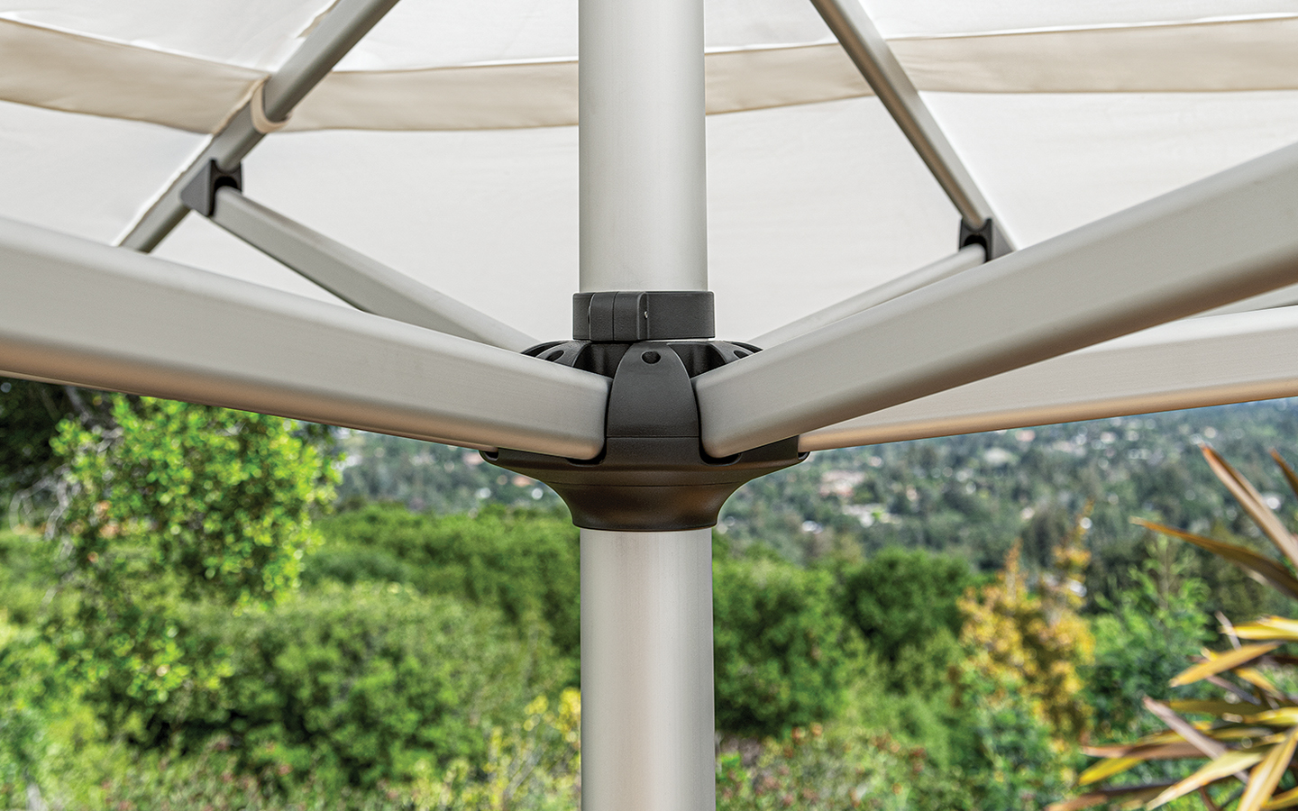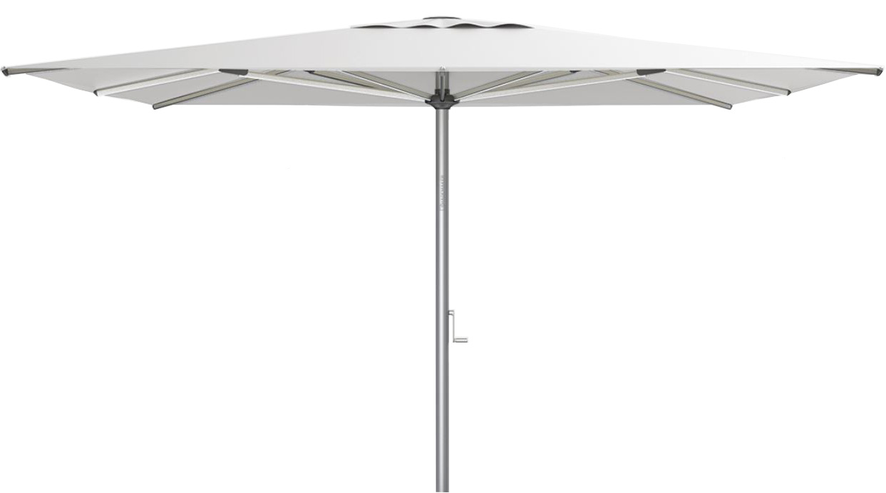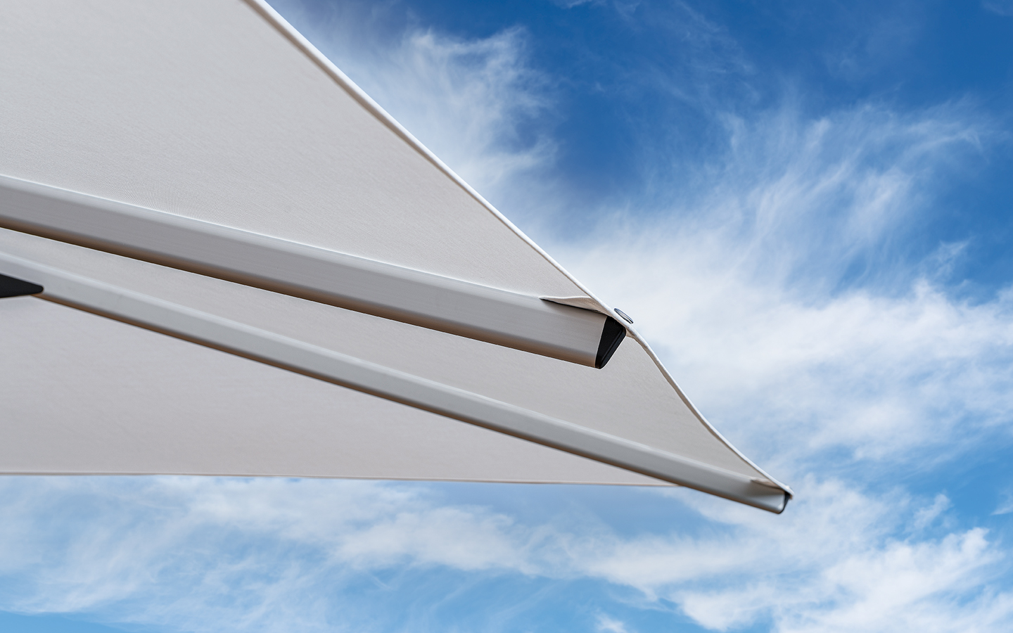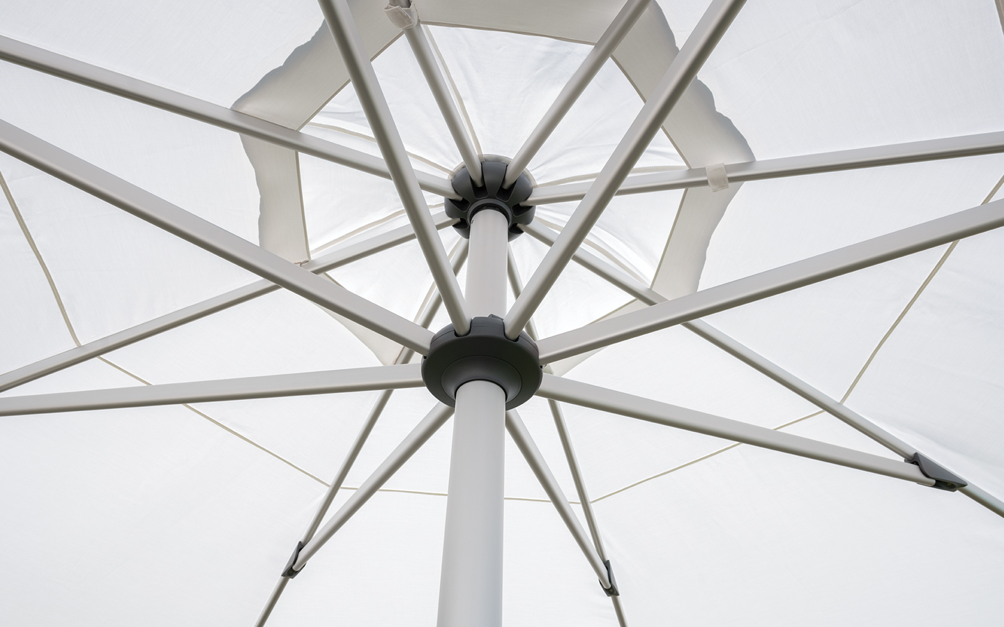 Das architektonische Design des Sonnenschirms Shademaker basiert auf einem einheitlichen Design mit klarer Form und Struktur. Auf dieser Basis bestimmt der moderne Stil aus eloxierten Spiegelrahmen und hochwertigen Textilien das unverwechselbare Erscheinungsbild jedes Schirms der Shademaker-Serie.