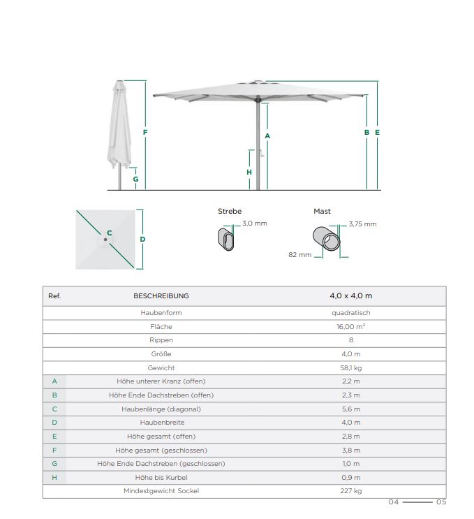 - Erfordert ein Fundament, abhängig von der Schirmgröße: