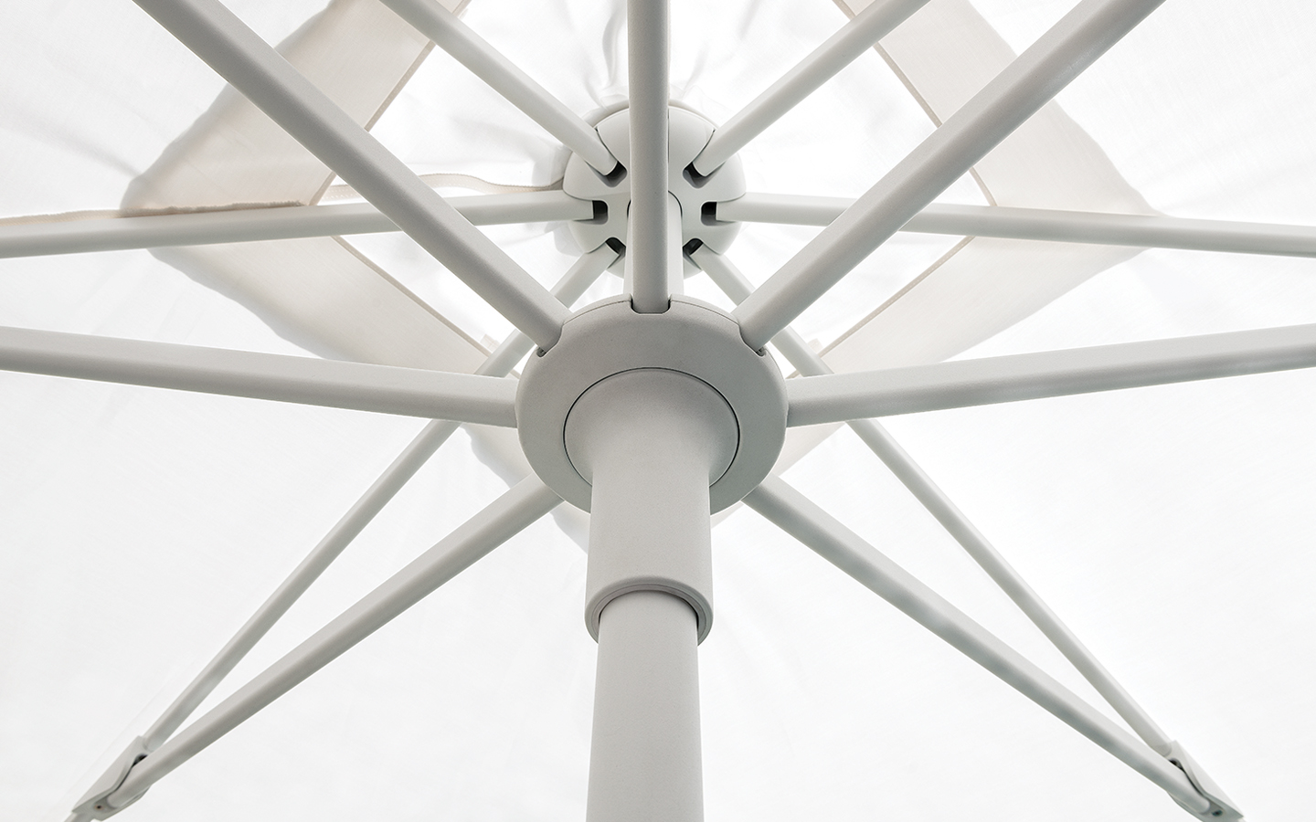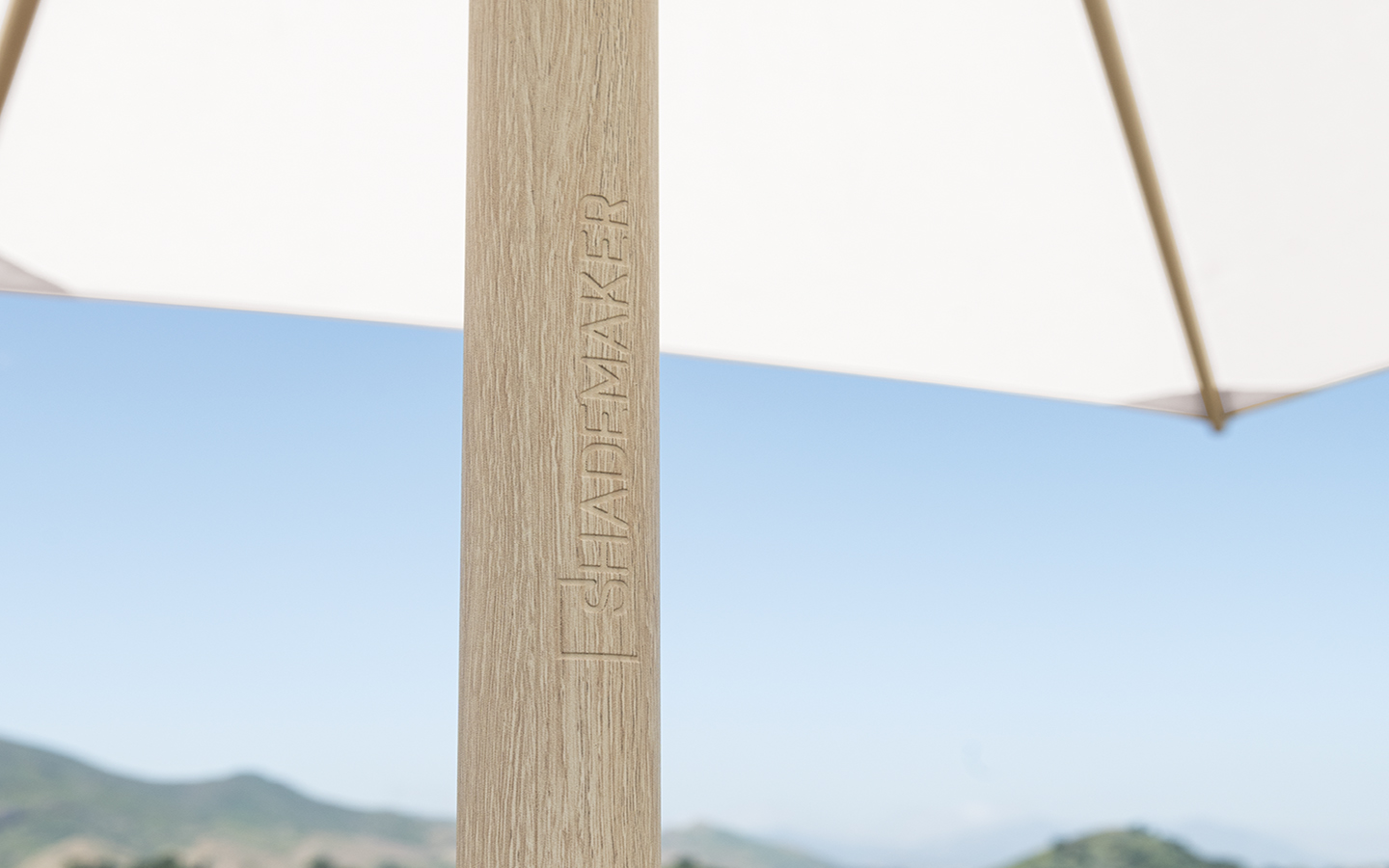 Das architektonische Design des Sonnenschirms Shademaker basiert auf einem einheitlichen Design mit klarer Form und Struktur. Auf dieser Basis bestimmt der moderne Stil aus eloxierten Spiegelrahmen und hochwertigen Textilien das unverwechselbare Erscheinungsbild jedes Schirms der Shademaker-Serie.