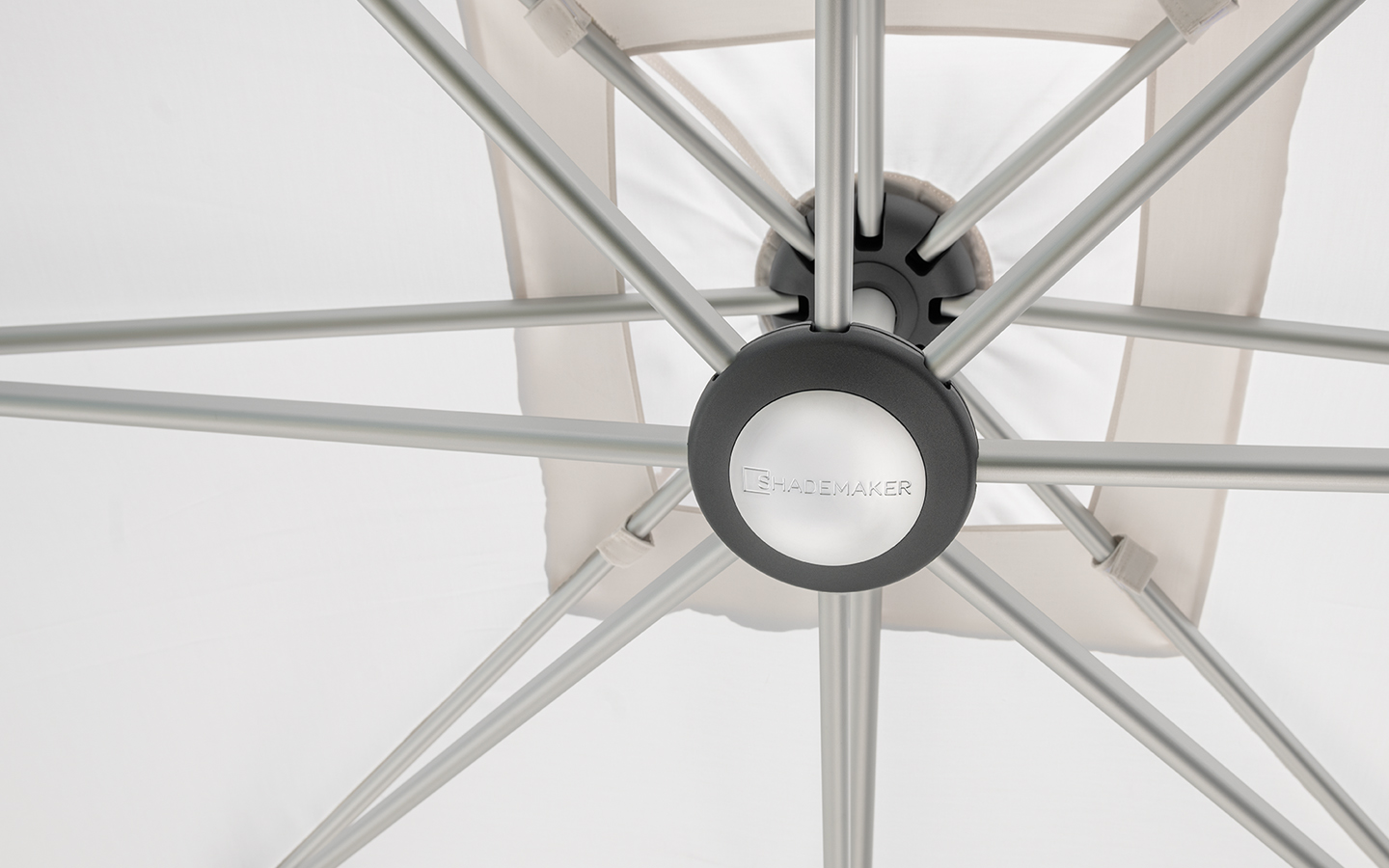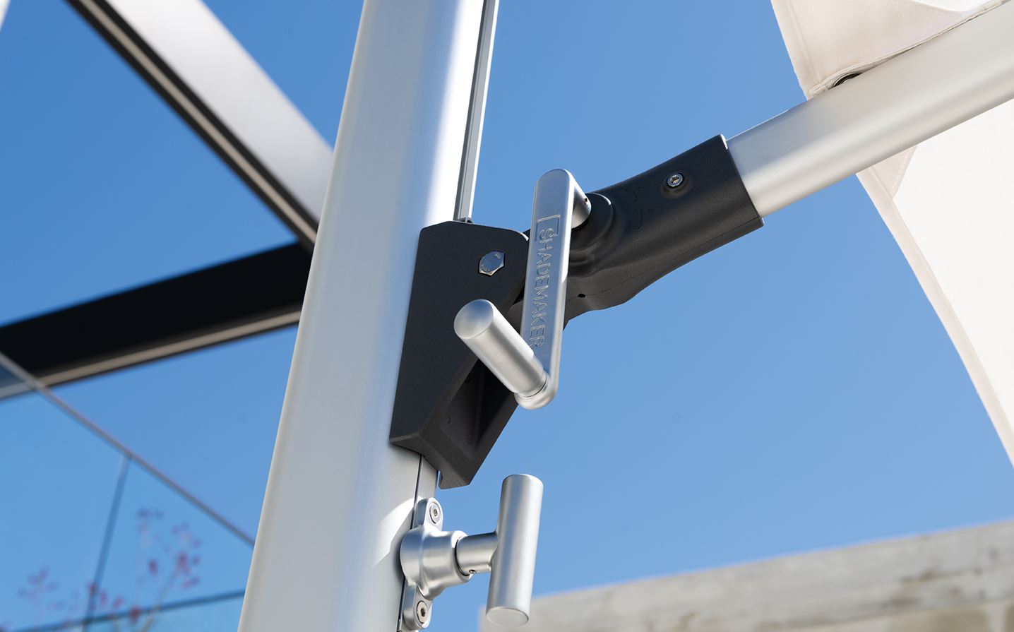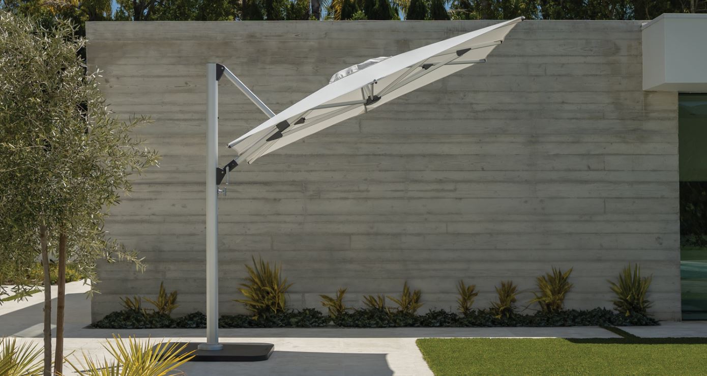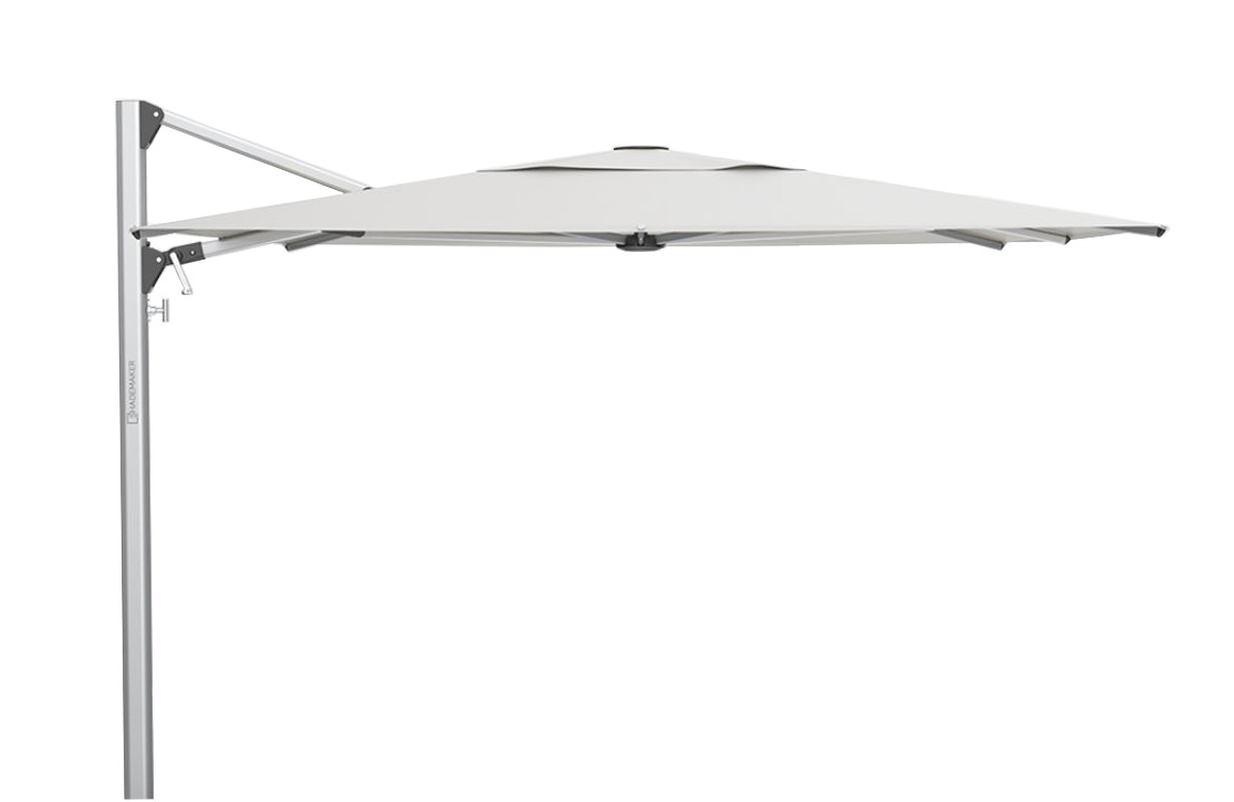 Das architektonische Design des Sonnenschirms Shademaker basiert auf einem einheitlichen Design mit klarer Form und Struktur. Auf dieser Basis bestimmt der moderne Stil aus eloxierten Spiegelrahmen und hochwertigen Textilien das unverwechselbare Erscheinungsbild jedes Schirms der Shademaker-Serie.
