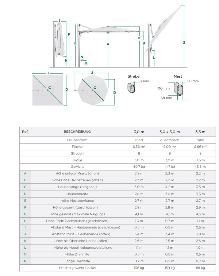- Erfordert ein Fundament, abhängig von der Schirmgröße: